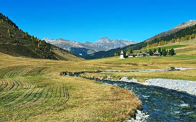 From here, the path becomes narrower and more challenging. A mountain bike route runs alongside. It’s good that walkers and cyclists have separate paths on this narrow section, so we don’t get in each other’s way. This part of the route has more trees in beautiful colours. We walk through a sunny, wooded landscape. After a while, we reach the charming village of Sertig. In the middle of the valley, we see the quaint white church. It is a beautiful sight with the rugged mountains in the background. The church stands out brightly against the colourful autumn forests. Then it is time for lunch at Walserhuus Sertig. We sit happily on the terrace because the sun is shining fully. The food they serve is delicious. We will definitely come back!
