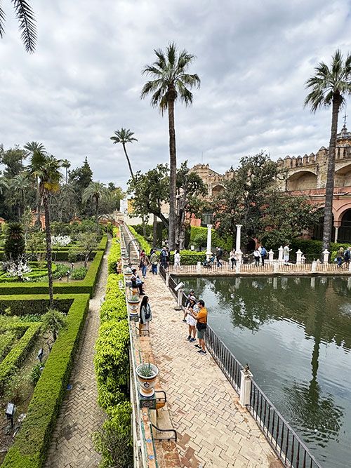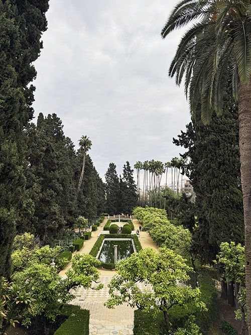 We walk outside and step into the gardens. The contrast is striking. Indoors everything was intense and full. Outside, a world opens that breathes more freely. Long sightlines draw your gaze forward and give the garden an almost regal calm. Galleries offer shade and guide you along walls that once provided protection. Here, the Alcázar feels even larger than it does inside.