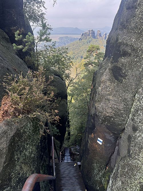 The notorious Himmelsleiter then challenges us with its narrow, steep steps. We climb up through a narrow rock crevice towards the heavens. At the top, another beautiful panorama over the surrounding rocks and forests awaits us. Our cameras work overtime in this glorious weather.