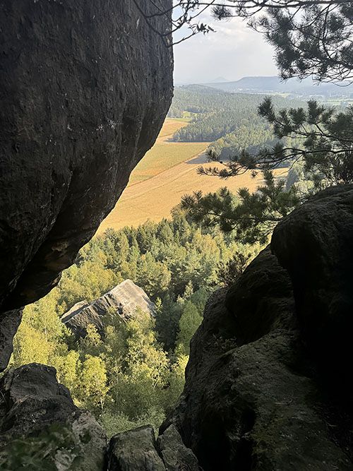 We pause at the welcoming Bergrestaurant Pfaffenstein, where walkers have been resting since 1898. Our route then continues to the famous “eye of the needle”, a narrow passage in the rock wall. This natural tunnel owes its name to the tight gap through which you can just squeeze. It’s an exciting part of the trail where we must wriggle our way through the rock formation.