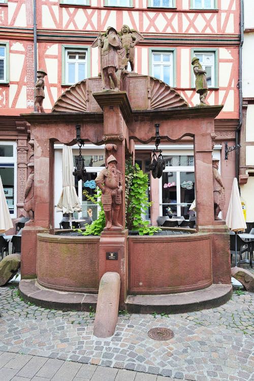 Next to the old town hall stands the Angel Fountain, dating from 1574. It is named after the two angels atop the fountain, who hold the coat of arms of the County of Wertheim. The artwork also associates important figures from the town’s history with planets and zodiac signs.
